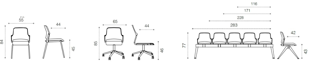 Versões: Giratória e 4 pés. Costa em polipropileno, revestida e em rede.